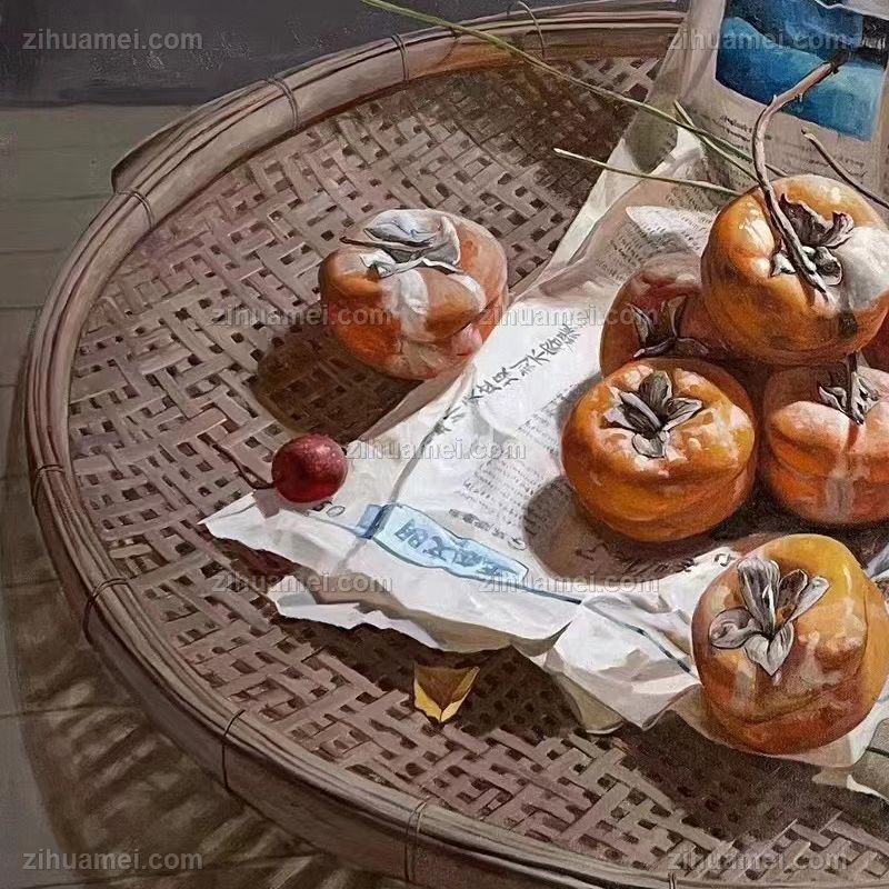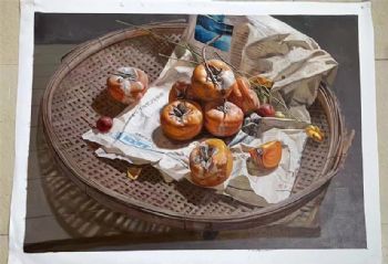 写实静物手绘油画好柿一箩框柿子图事事如意 手绘