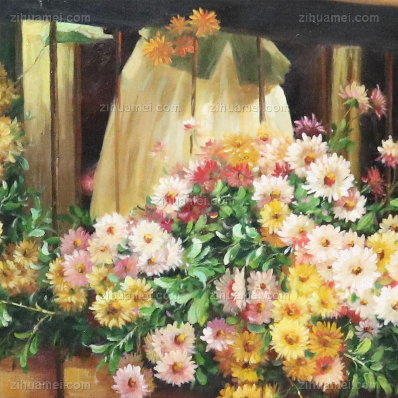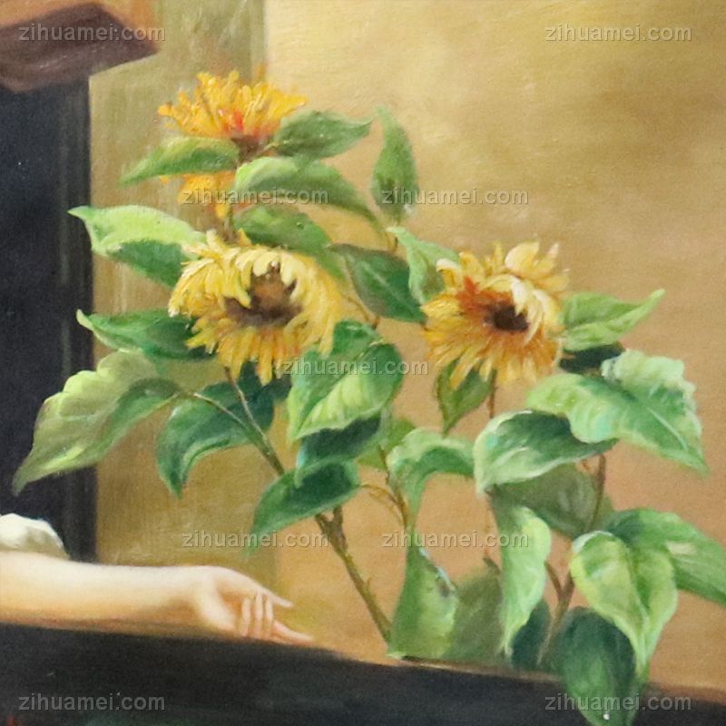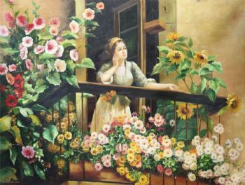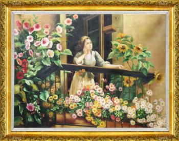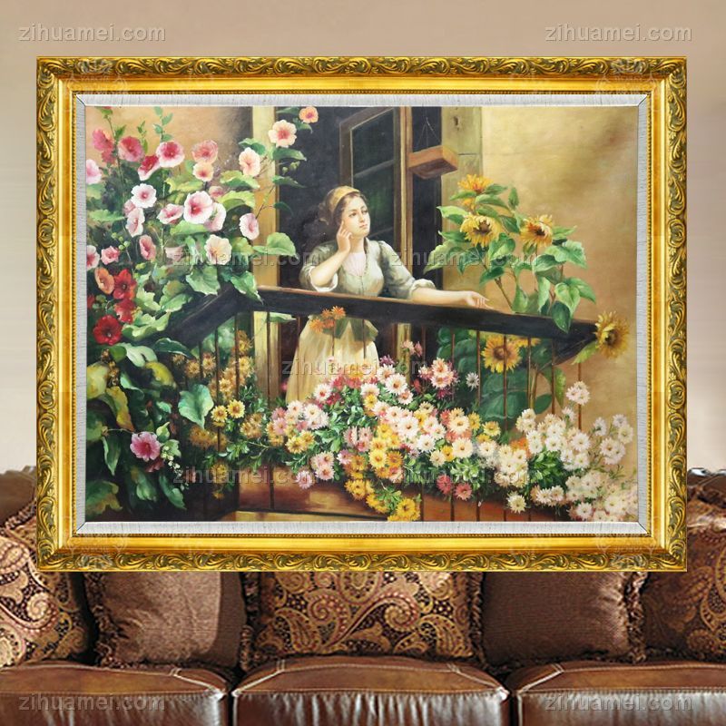 • 欧式经典油画 欧美人物画 酒店装饰油画 纯手绘手工 站在阳台的美少女与花朵 线条框