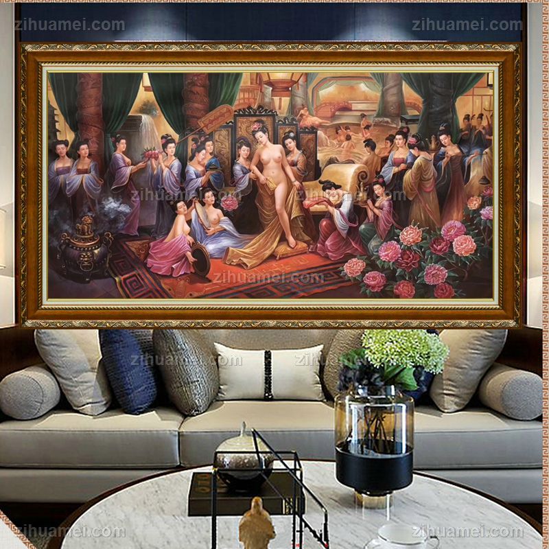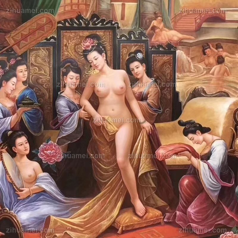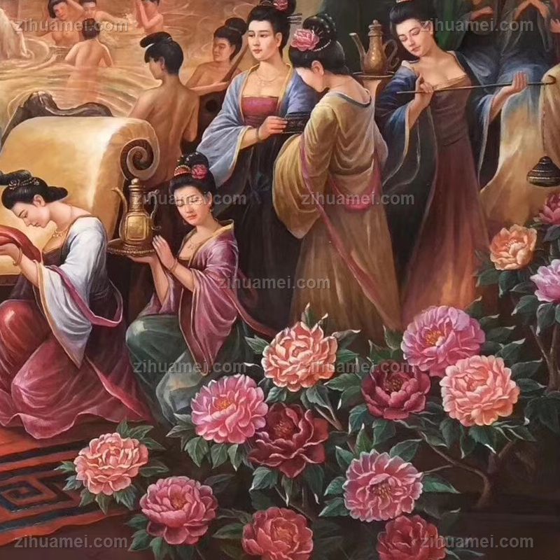 • 纯手绘大型人物油画贵妃沐浴图精品牡丹人物逼真形象适合酒店大厅挂画