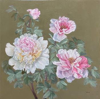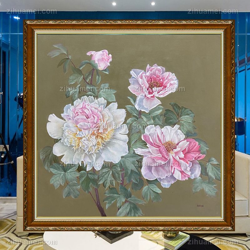 • 中式古典 玄关装饰画 客厅 卧室 手绘油画 花开富贵 牡丹图 写实油画