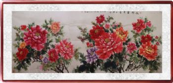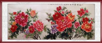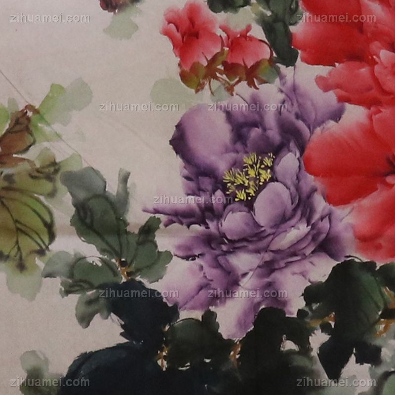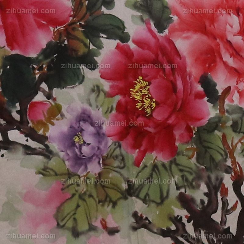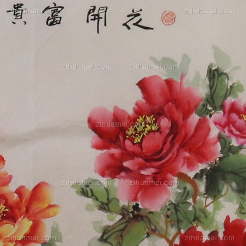 • 王骏 手绘 手工 花开富贵 国画牡丹 典雅红褐实木框