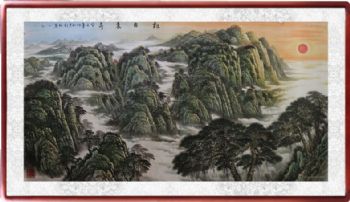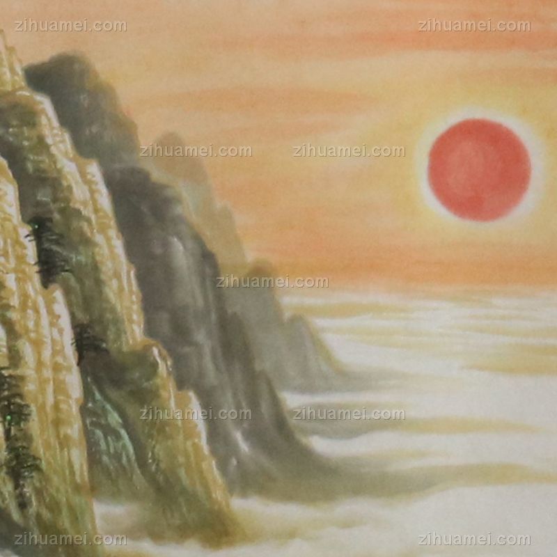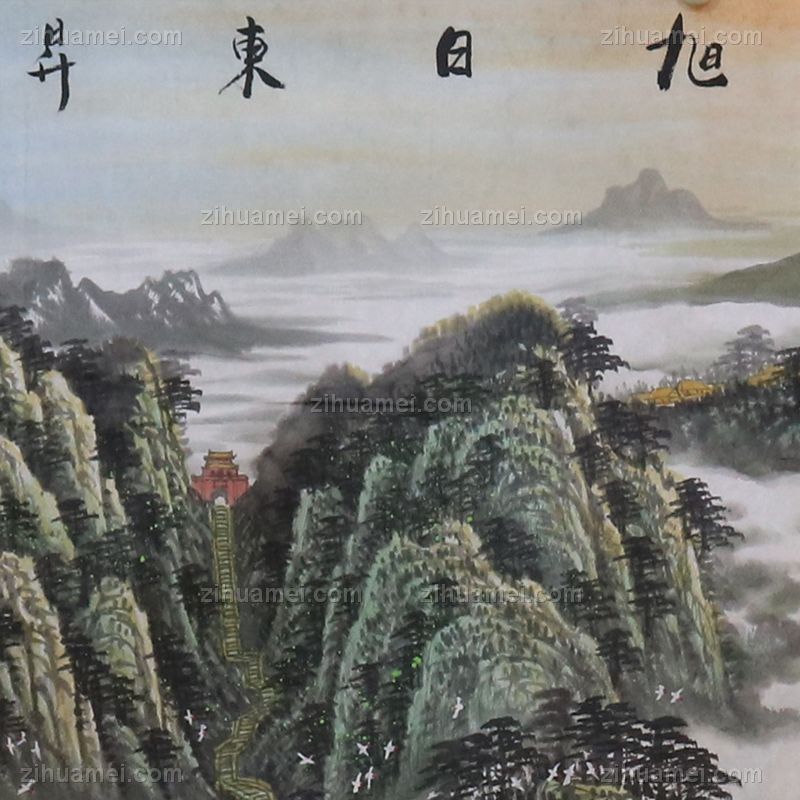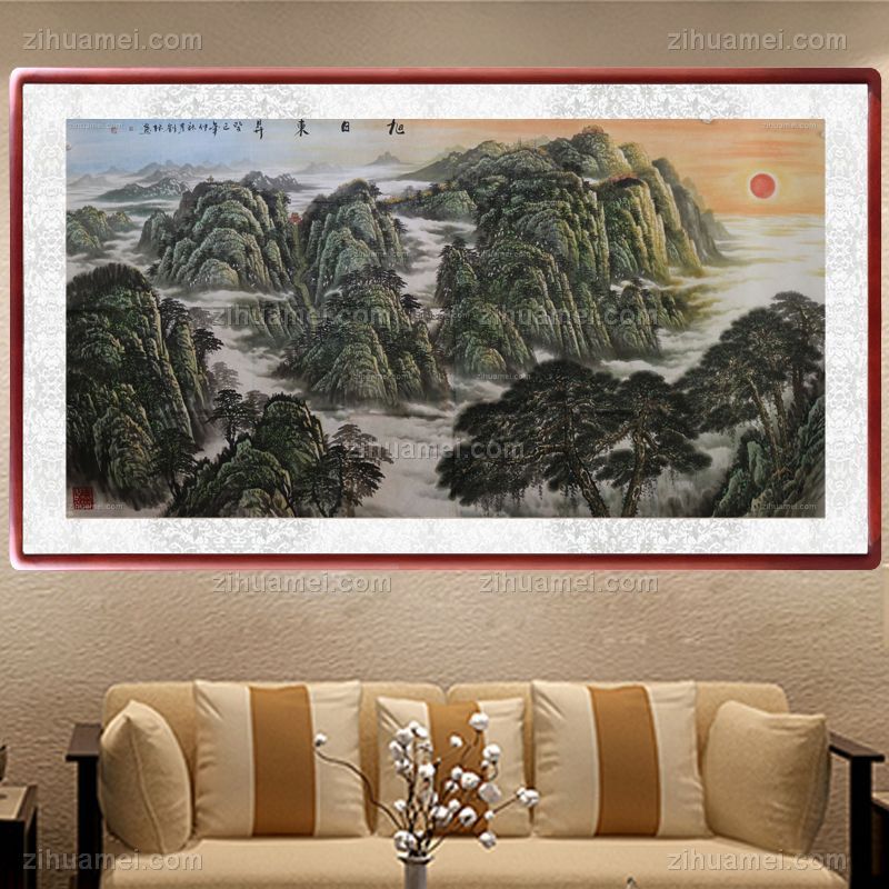 • 山水画 山水国画 旭日东升 泰山 日出 典雅红褐实木框 手绘 手工 国画