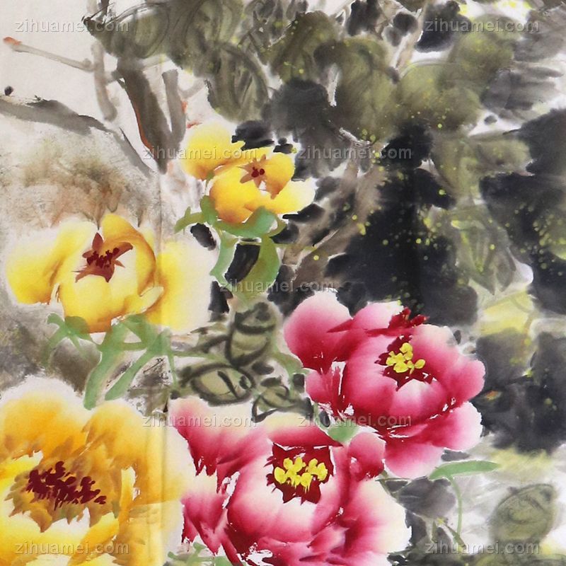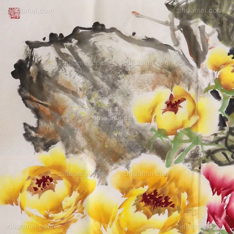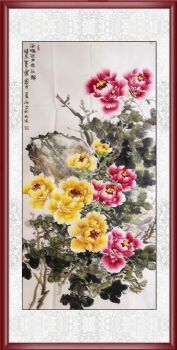 • 手绘 手工 国画牡丹 洛阳牡丹 典雅红褐实木框