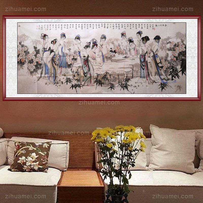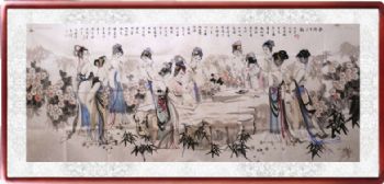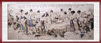 • 手绘人物画 金陵十三钗 国画 典雅红褐实木框
