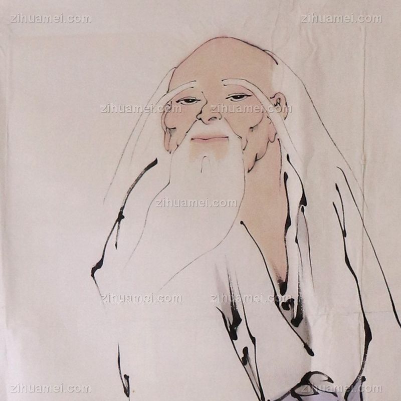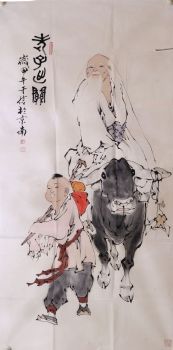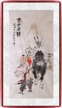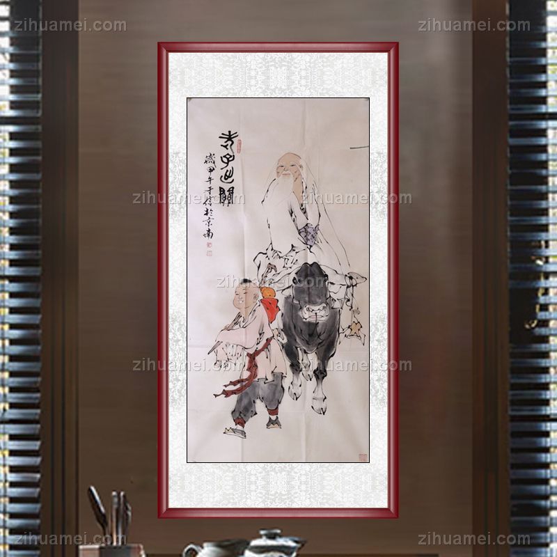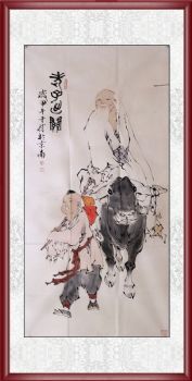 • 手绘 人物画 国画 老子出关图 有老有少 典雅红褐实木框
