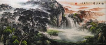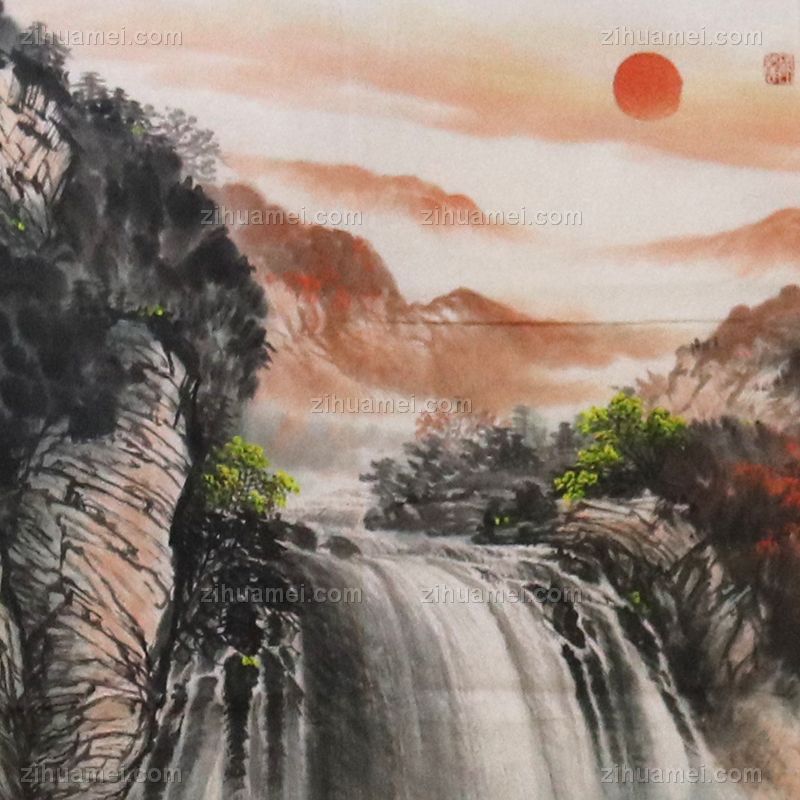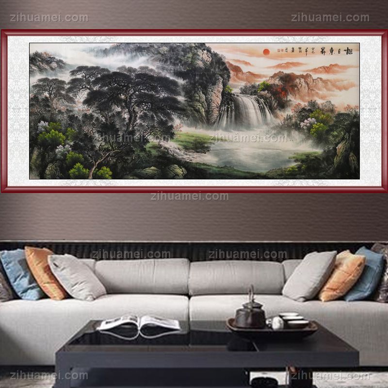 • 家庭挂画 山水画 酒店挂画 企业挂画 旭日东升 手绘 手工 国画 典雅红褐实木框