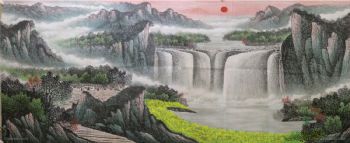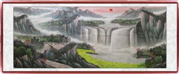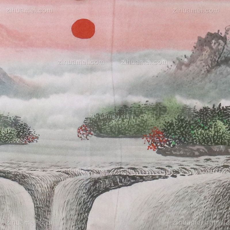 • 手绘 山水画 国画 旭日东升源远长流 典雅红褐实木框