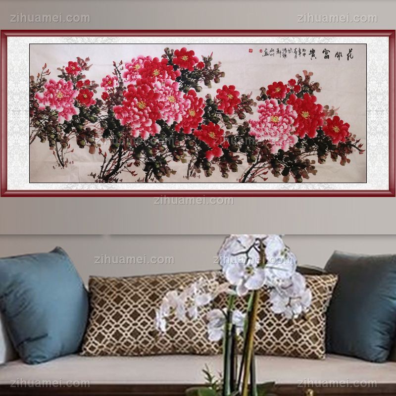 • 手绘 手工 花开富贵 国画牡丹 典雅红褐实木框