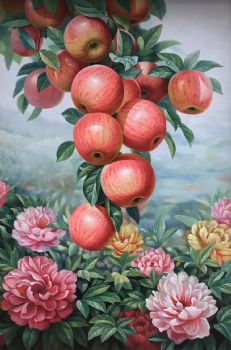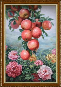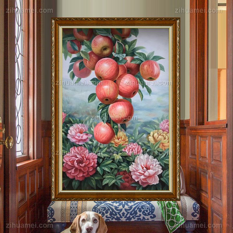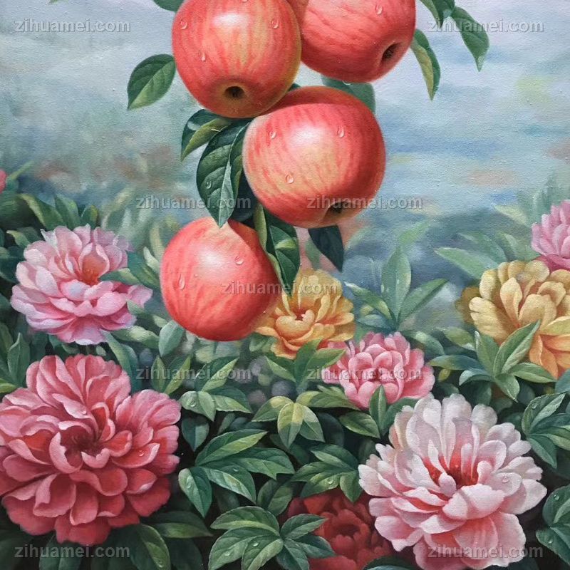 • 纯手绘手工写实油画苹果与牡丹寓意平平安安富贵吉祥油画实木画框