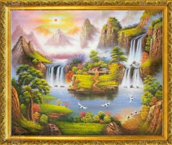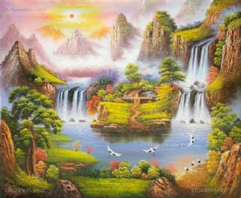 • 风水油画 聚宝盆 青松 白鹤 瀑布 木屋 纯手绘手工 线条框