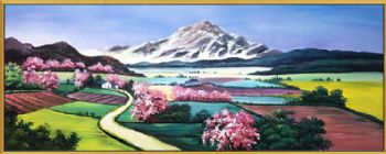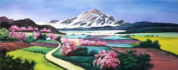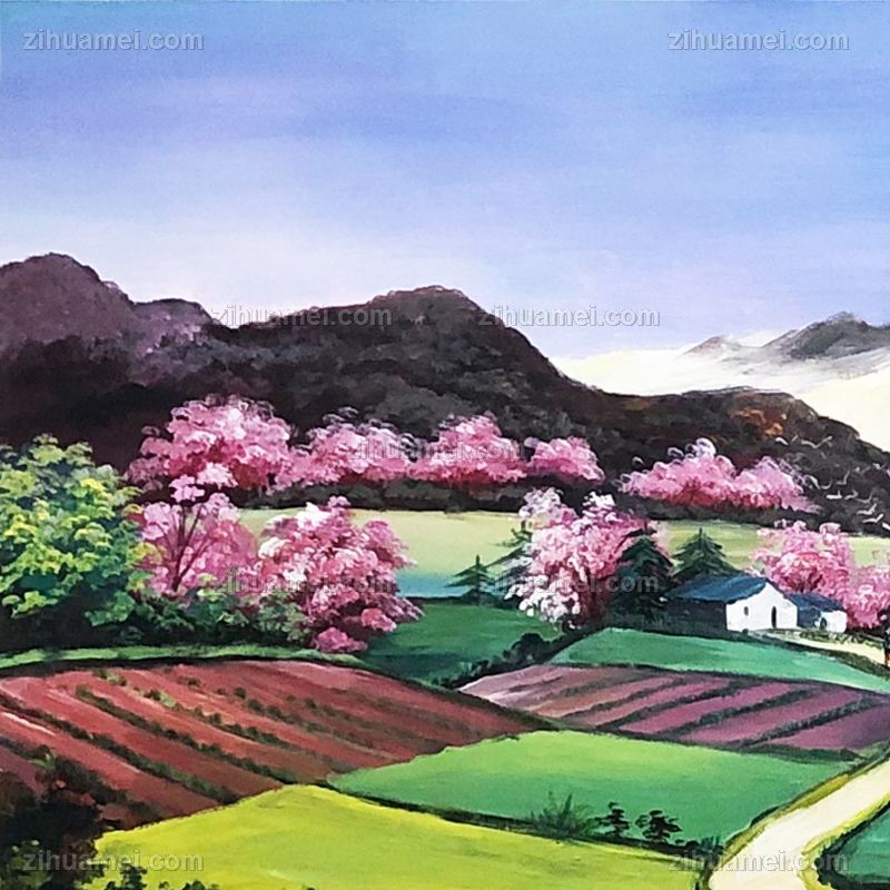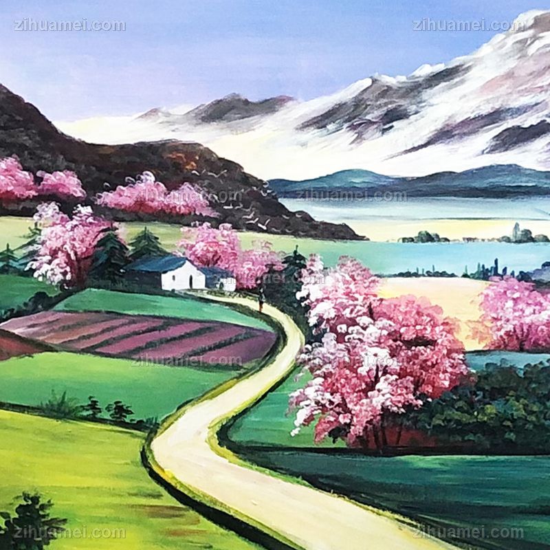 • 纯手绘美式风景油画桃花开时的田园风光景物油画写意风景画