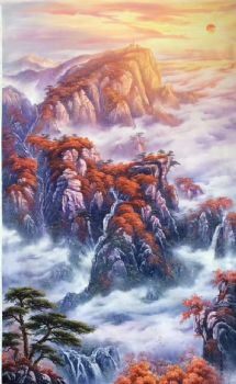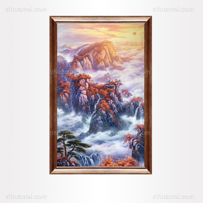 迎客松旭日东升中式山水风景油画纯手绘大厅挂画 手绘