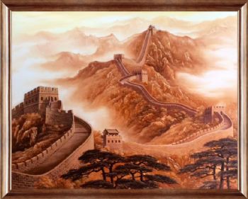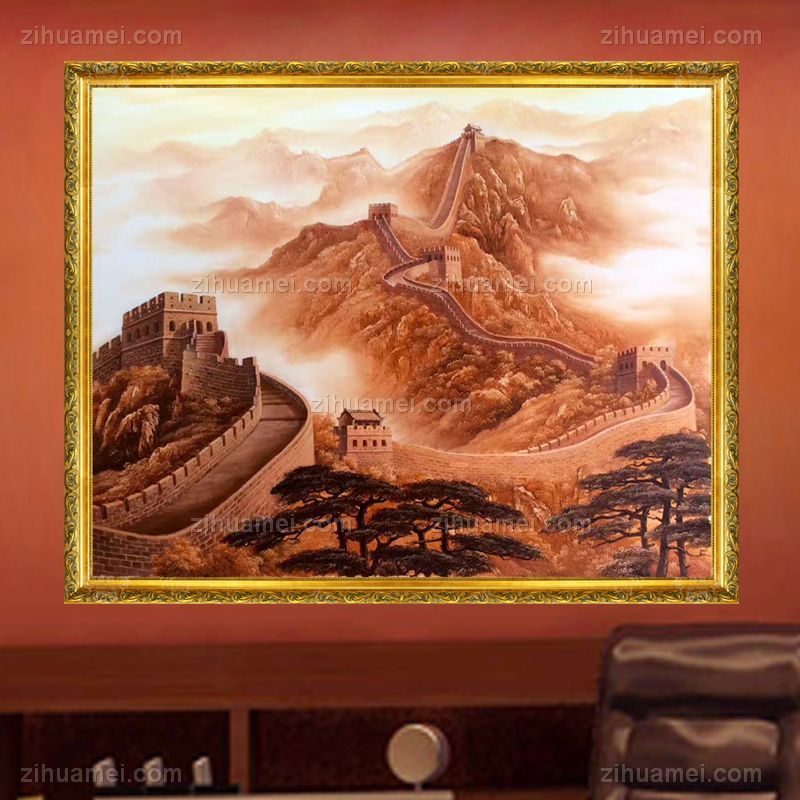 基业长青新中式手绘长城风景油画实木画框 手绘