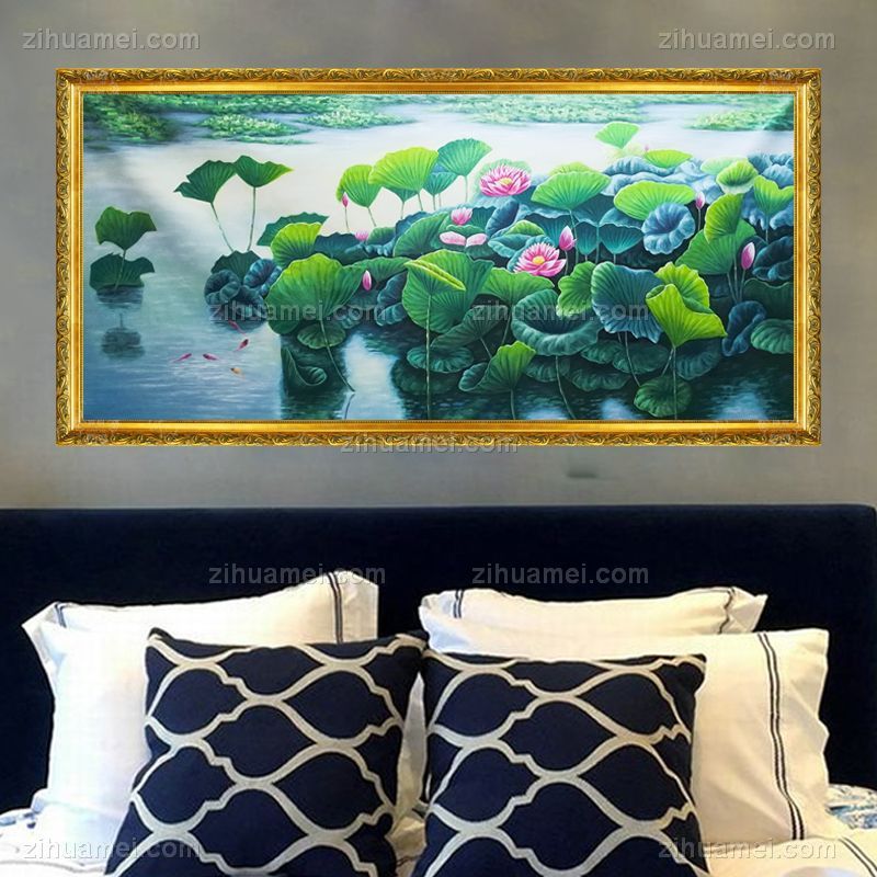 荷花风景手绘油画中式和和美美玄关油画实木画框 手绘