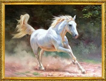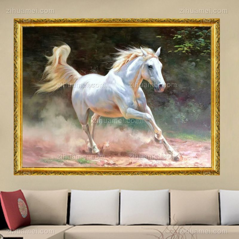 精品花卉白马图纯手绘写实动物油画实木画框 手绘