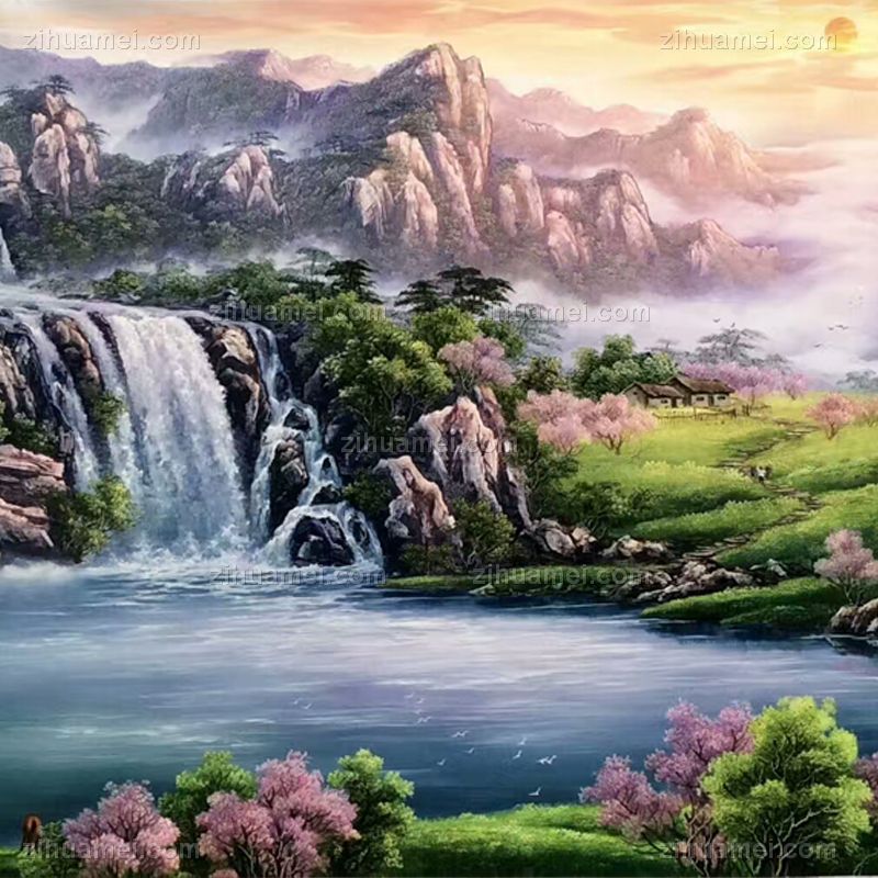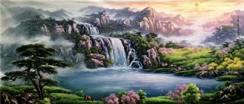 山川风景桃花开纯手绘油画作品中式风景油画 手绘