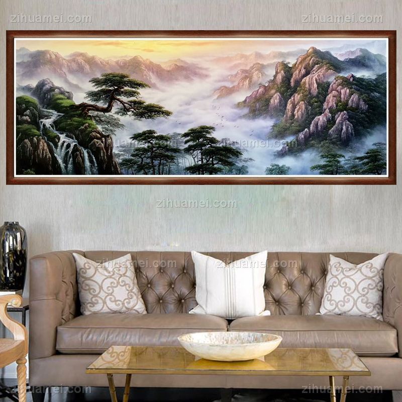 迎客松旭日东升中式山水风景油画纯手绘大厅挂画 手绘