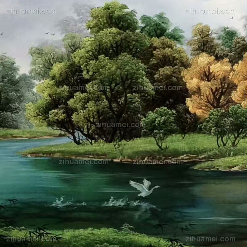 刀画 山水油画 森林 水流 天鹅
