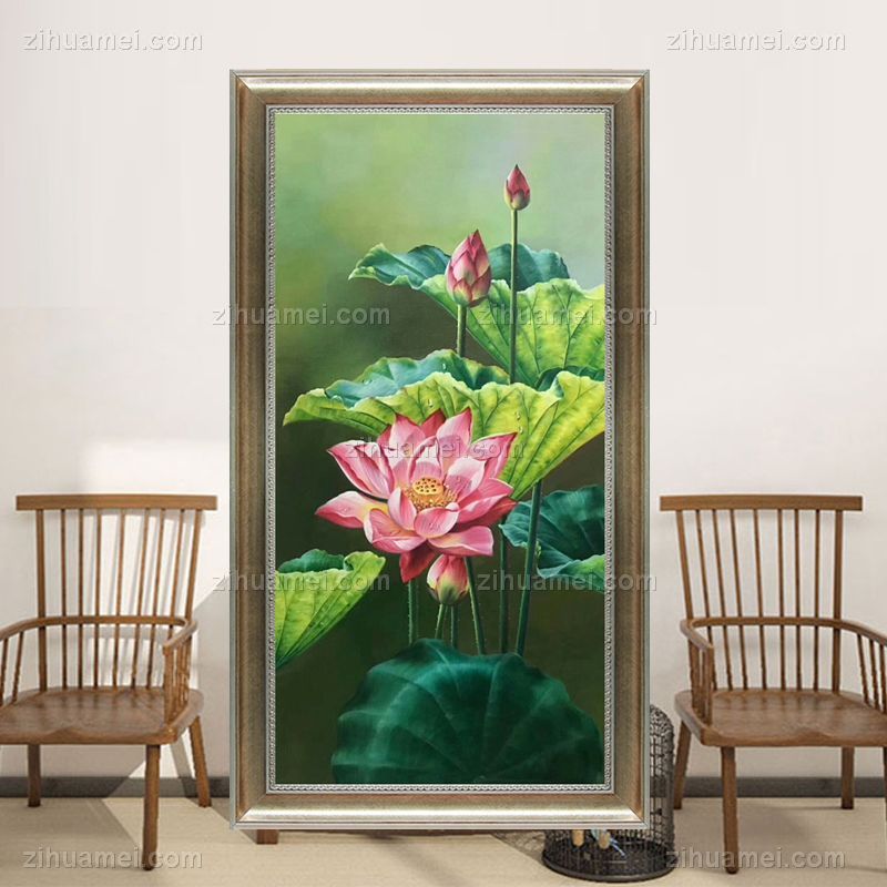 荷花风景手绘油画中式和和美美玄关油画实木画框 手绘