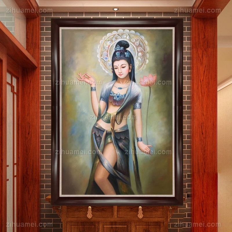 • 新中式客厅玄关装饰画敦煌壁飞天观音手绘油画 A