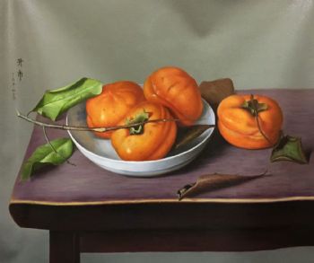 好事一箩框新中式静物写实油画事事如意柿子图 手绘