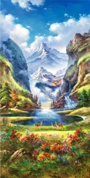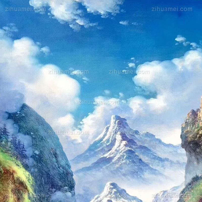 • 风水油画 聚宝盆 白云 高山 小鹿 纯手绘手工 线条框