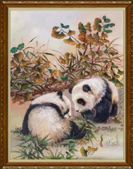 纯手绘动物油画熊猫父子图精品写实油画实木画框 手绘