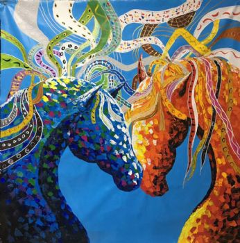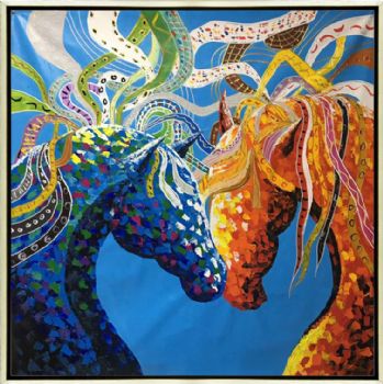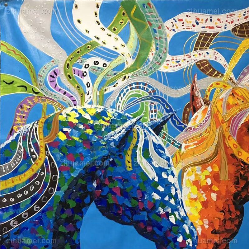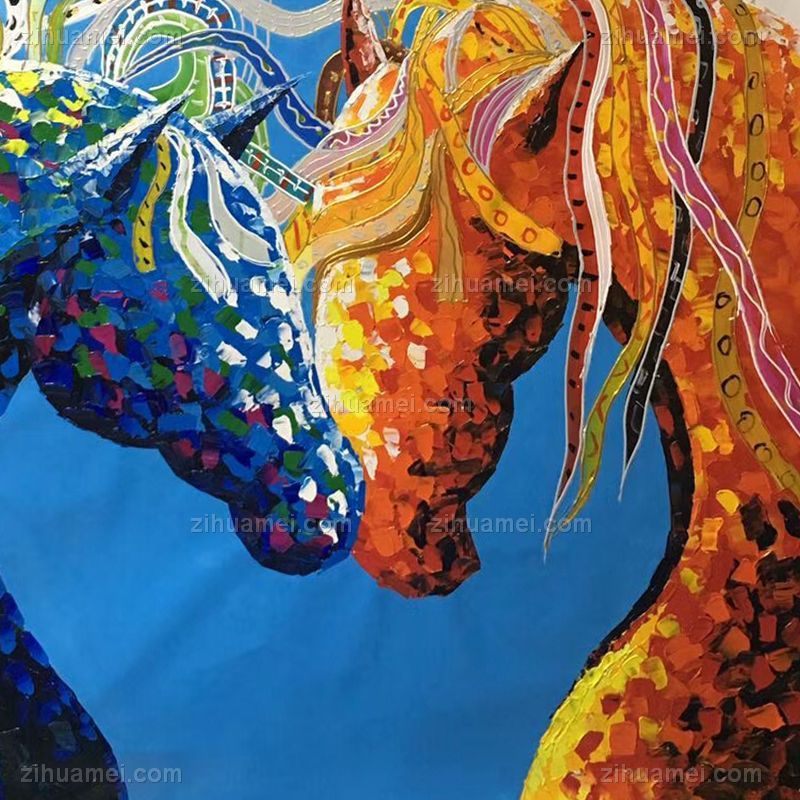 • 纯手绘手工家庭挂画酒店挂画玄观中式挂画多彩的马装饰画线条框