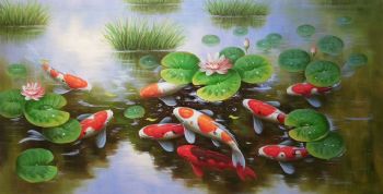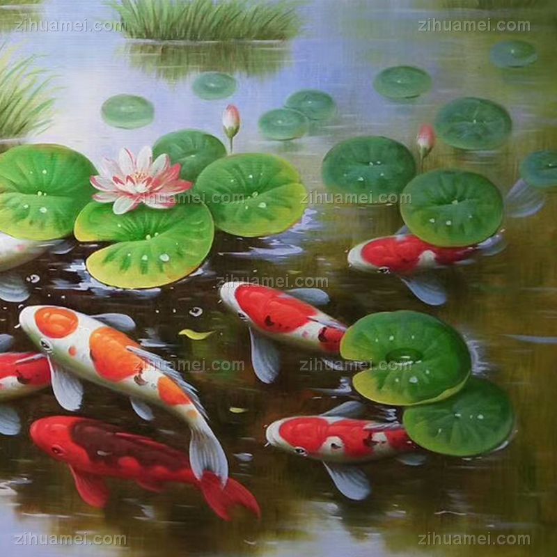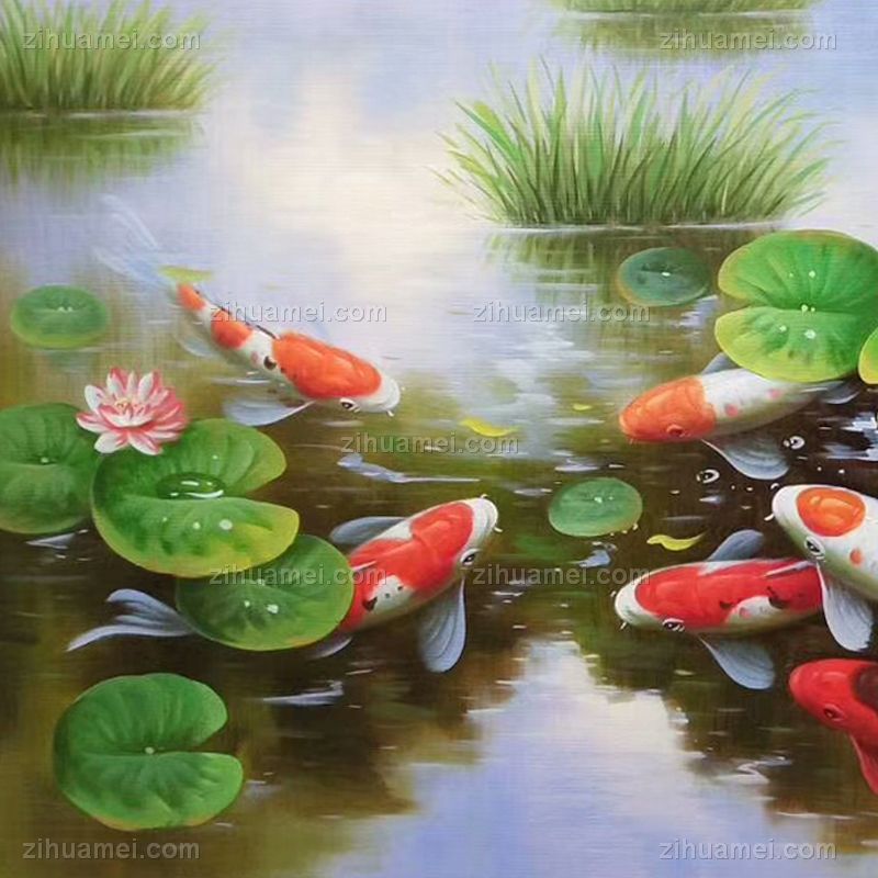 • 纯手绘手工 九鱼图 荷花 和谐 美满 团团圆圆 中式油画 家庭挂画