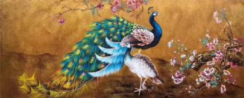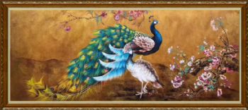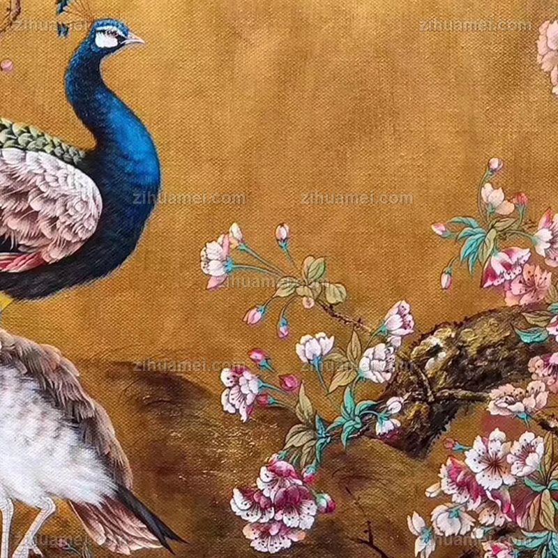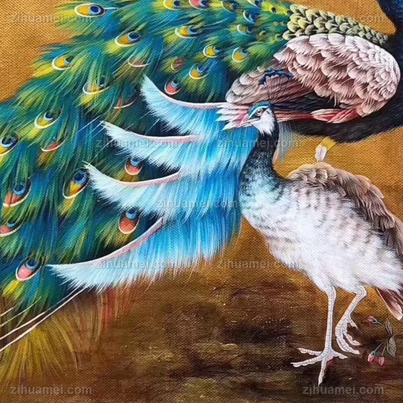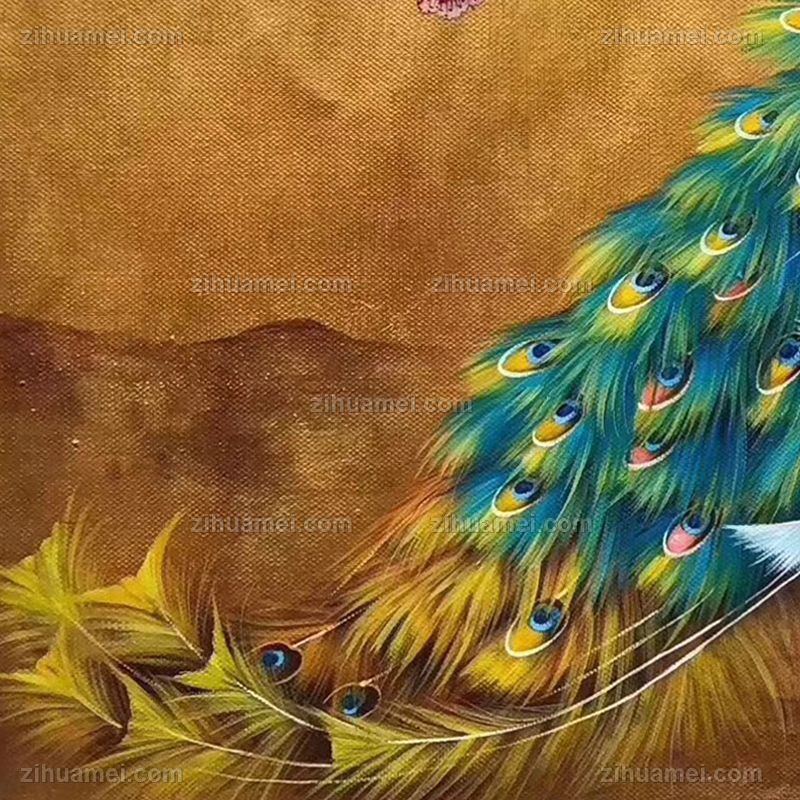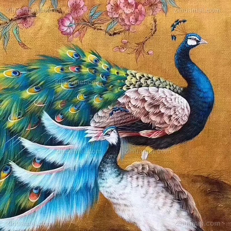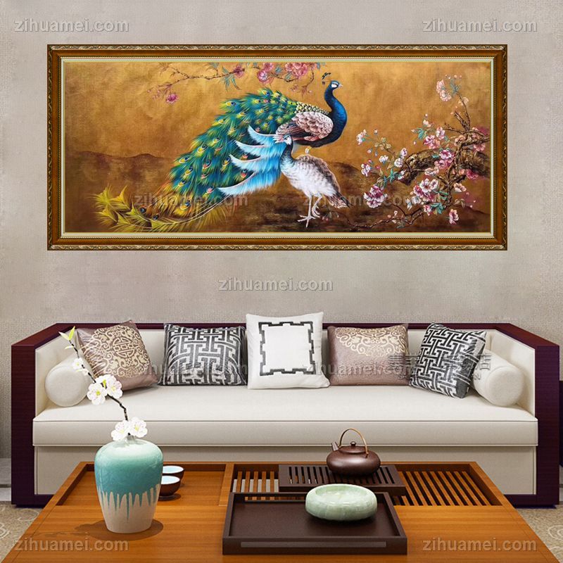 • 高品质油画手绘油画孔雀花开富贵吉祥如意壁画横幅中式客厅装饰画