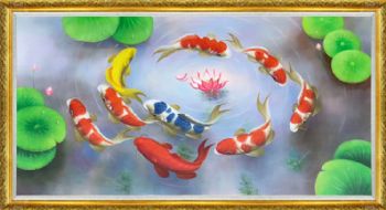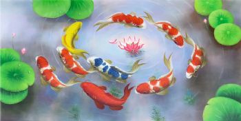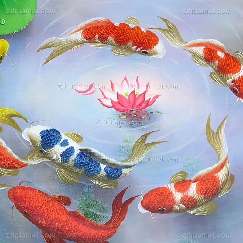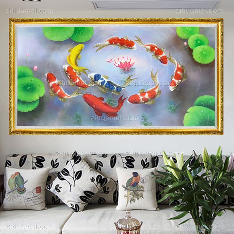 • 纯手绘手工 九鱼图 荷花 和谐 美满 团团圆圆 中式油画 家庭挂画 客厅挂画