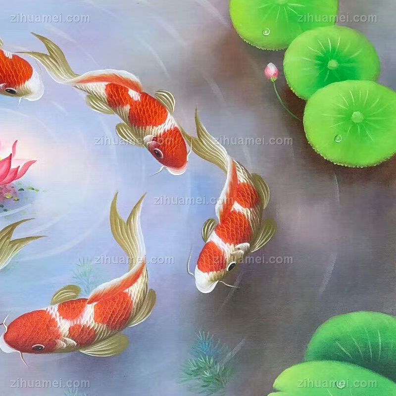新中式年年有余锦鲤图纯手绘玄关荷花风景油画 手绘