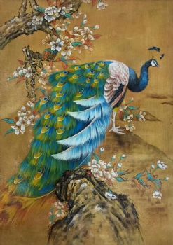 • 手绘客厅壁画富贵孔雀中式油画走廊挂画竖版玄关装饰画过道定制