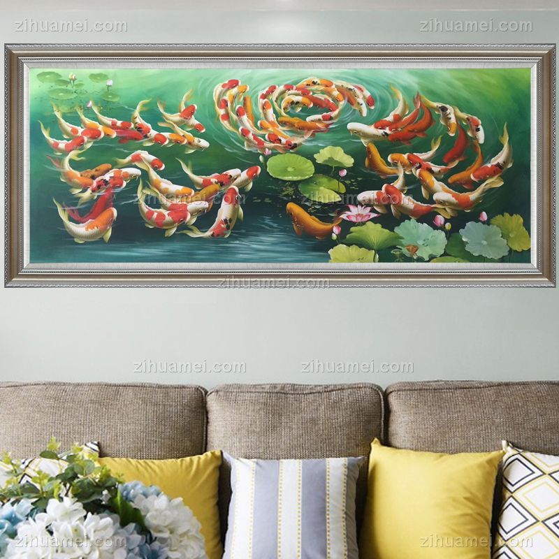 • 春-客厅油画九鱼图六六大顺六十六条鲤鱼现代家居中式油画纯手绘客厅挂画
