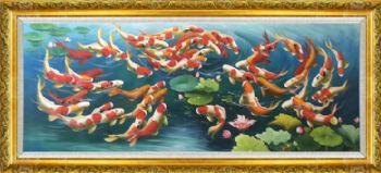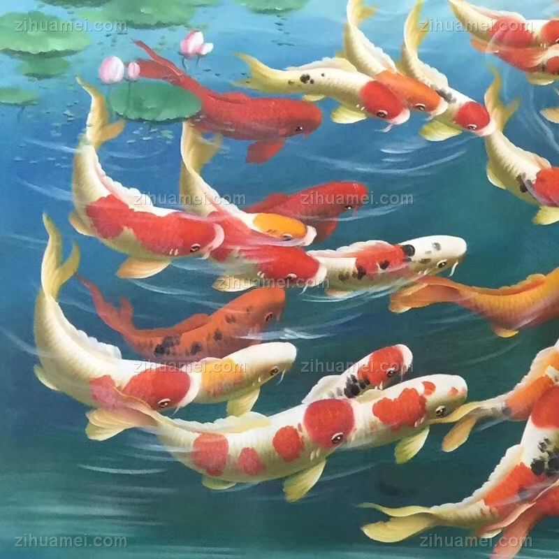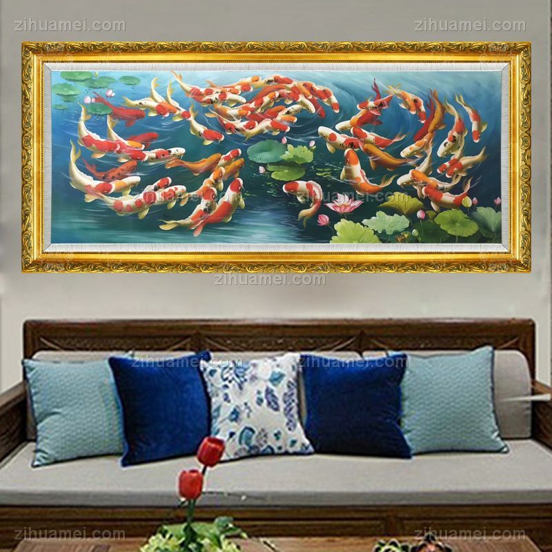 • 夏-客厅油画九鱼图六六大顺六十六条鲤鱼现代家居中式油画纯手绘客厅挂画