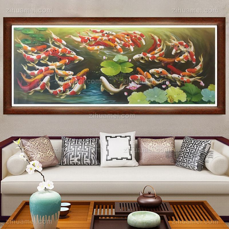 • 冬-客厅油画九鱼图六六大顺六十六条鲤鱼现代家居中式油画纯手绘客厅挂画