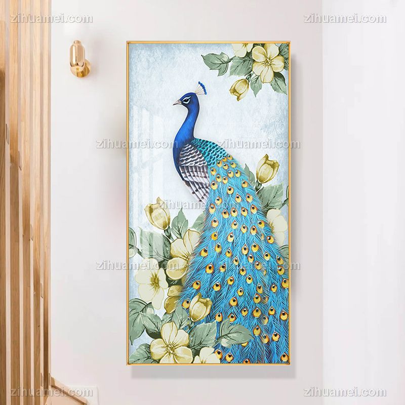 晶瓷画新中式玄关装饰画孔雀图晶瓷画晶瓷画铝合金外框画框装饰画画框