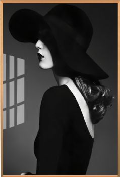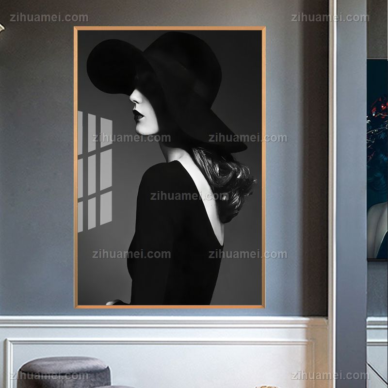 • 高档经典黑色轻奢晶瓷画戴帽子的女人装饰画铝合金框现代简约客厅走廊挂画