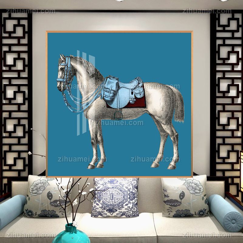 • 高档轻奢蓝色的富贵宝马晶瓷画装饰画铝合金适合框现代简约客厅挂画