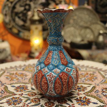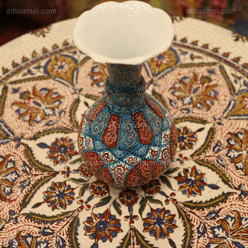 米娜mina是在金属表面上釉、着色、绘画的复杂艺术,采取细密画和珐琅工艺。在波斯语中的意思是女神的面纱,代表了天空的颜色,因此大部分的米娜是以天蓝色为底色,展现出了优美的体态和绚丽的色彩。在字画美中,可以看到各种独具波斯特色的杯盘和花瓶器皿,米娜盘大中小都有,精美细致,快快选购。