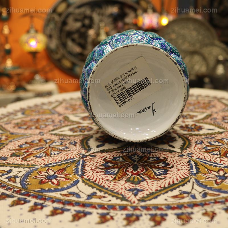 米娜mina是在金属表面上釉、着色、绘画的复杂艺术,采取细密画和珐琅工艺。在波斯语中的意思是女神的面纱,代表了天空的颜色,因此大部分的米娜是以天蓝色为底色,展现出了优美的体态和绚丽的色彩。在字画美中,可以看到各种独具波斯特色的杯盘和花瓶器皿,米娜盘大中小都有,精美细致,快快选购。