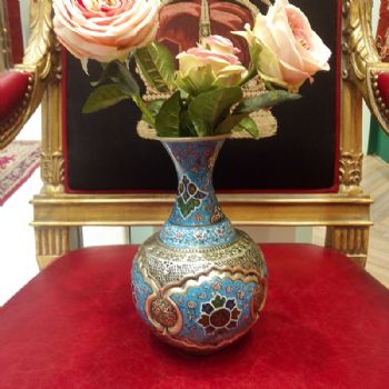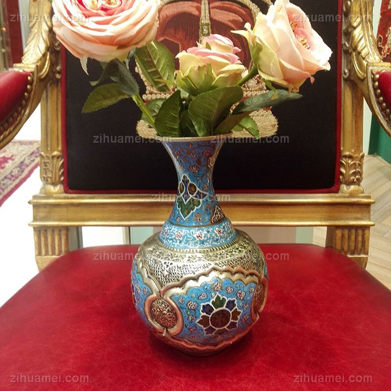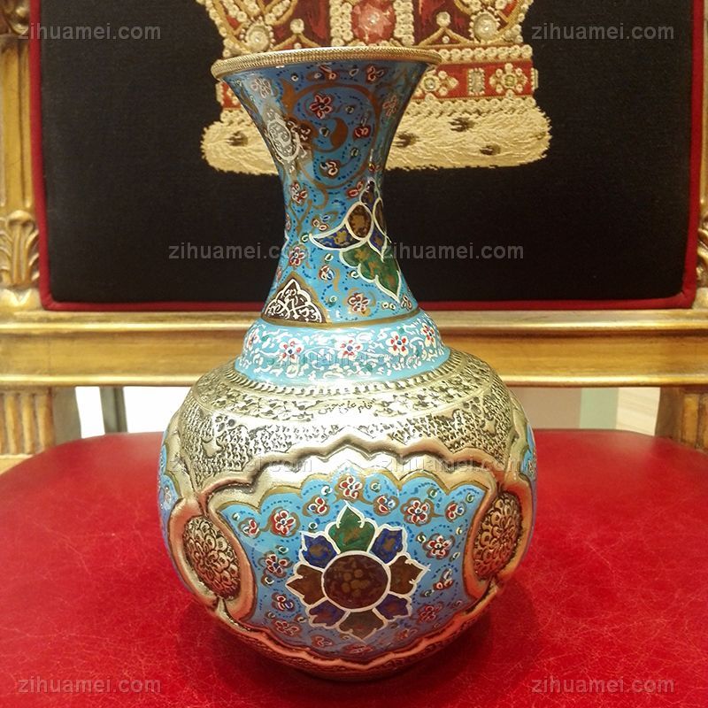 米娜mina是在金属表面上釉、着色、绘画的复杂艺术,采取细密画和珐琅工艺。在波斯语中的意思是女神的面纱,代表了天空的颜色,因此大部分的米娜是以天蓝色为底色,展现出了优美的体态和绚丽的色彩。在字画美中,可以看到各种独具波斯特色的杯盘和花瓶器皿,米娜盘大中小都有,精美细致,快快选购。