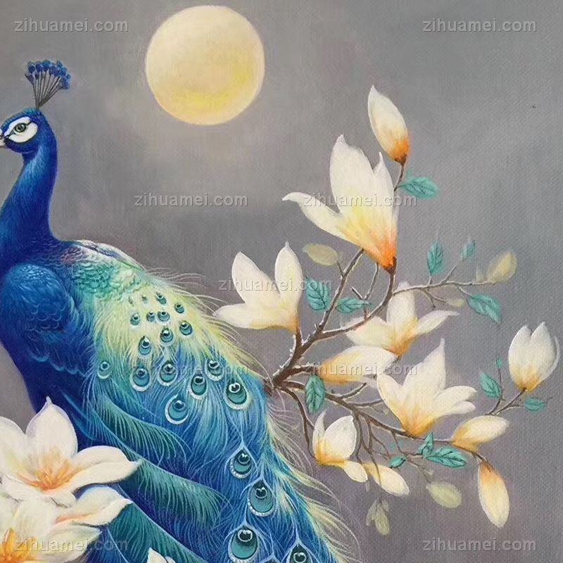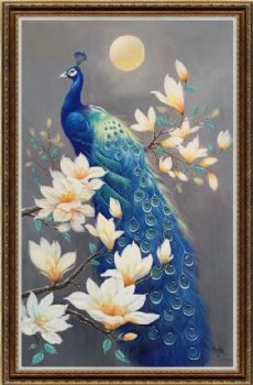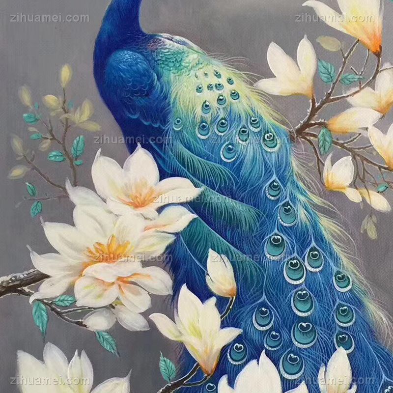 孔雀玉兰花纯手绘新中式客厅油画实木外框 手绘