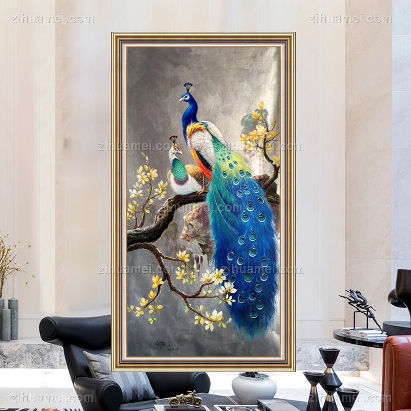 • 实力画家力作兰花孔雀立枝头中式油画玄关竖版油画美式客厅装饰画壁画手绘I油画