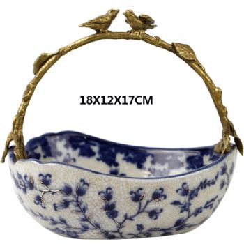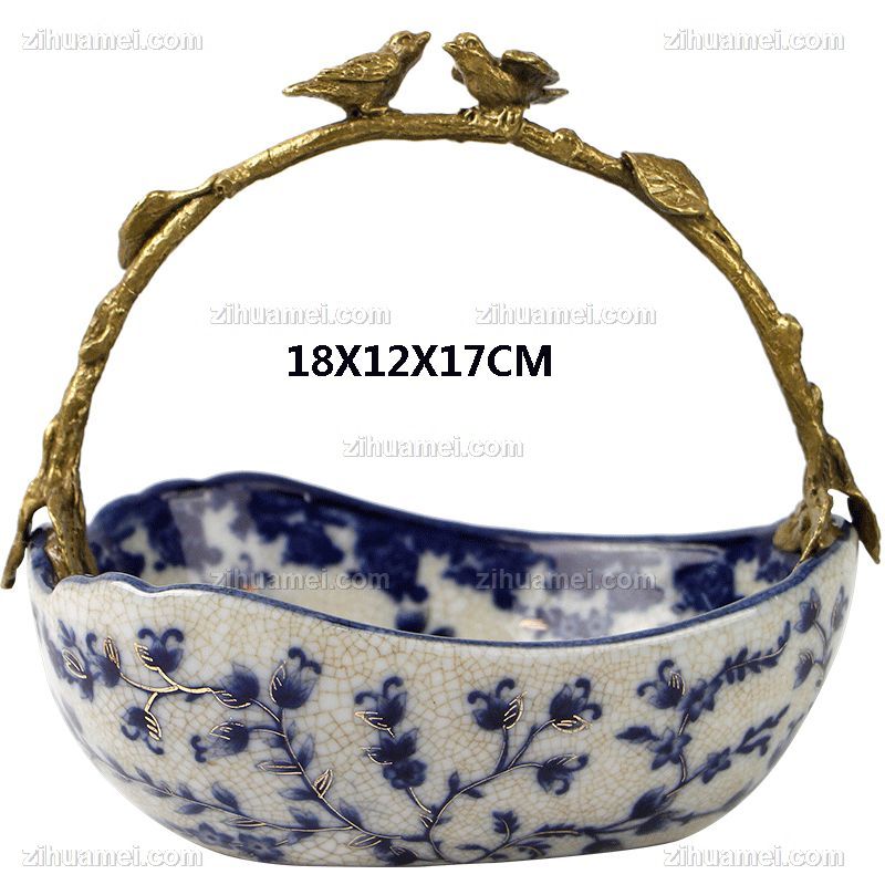• 陶瓷配铜平底提篮新中式工艺品摆件酒柜装饰品客厅玄关