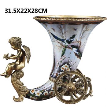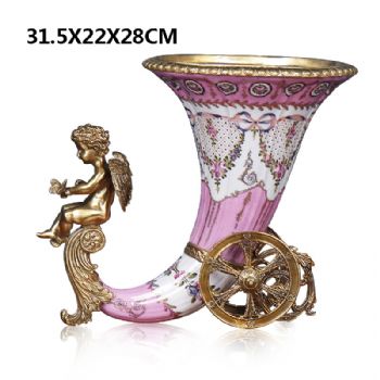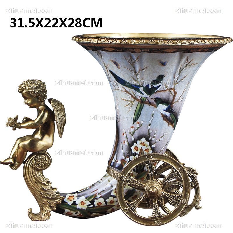• 欧式美式古典风格装饰牛角瓶花插陶瓷配铜摆件
