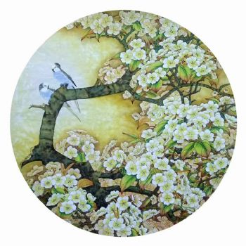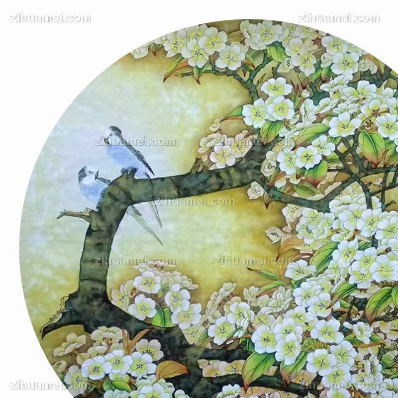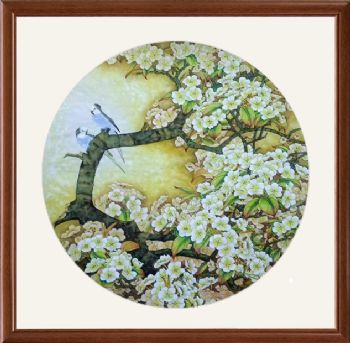 • 国画梨花花鸟画手绘原创花卉画国画手绘作品实木框柚木色
