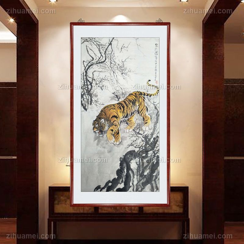 • 出巡图 猛虎下山 书画家胡景德先生手绘水墨国画 花梨木实木框 升值收藏作品力荐
