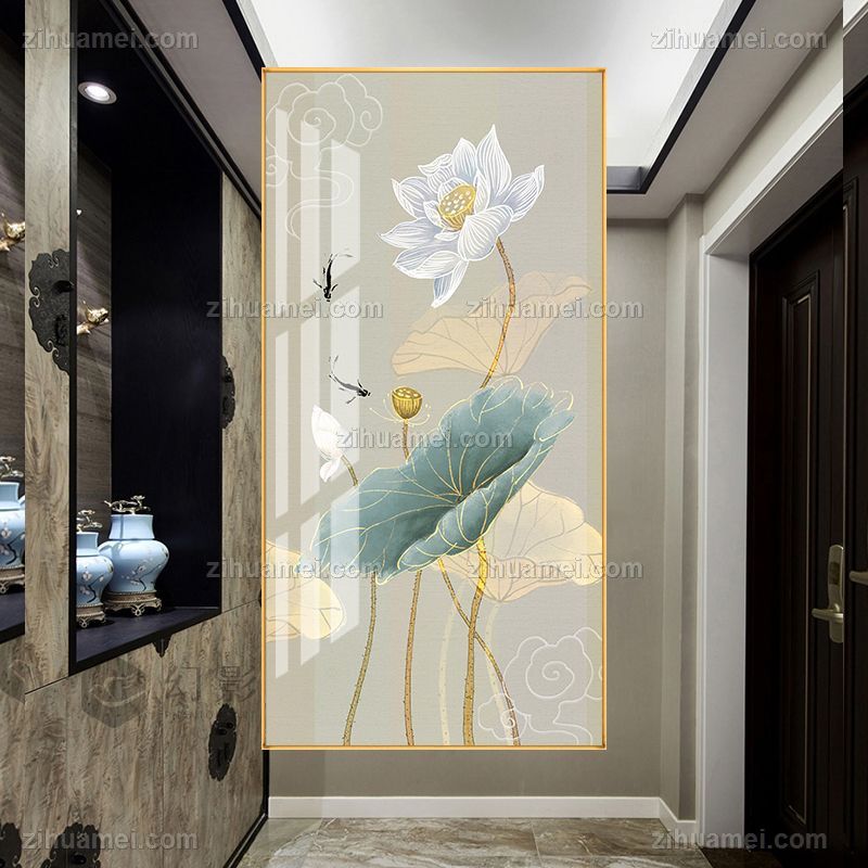 • 荷花寓意和和美美新中式年年有鱼玄关装饰画竖版过道走廊客厅挂画