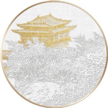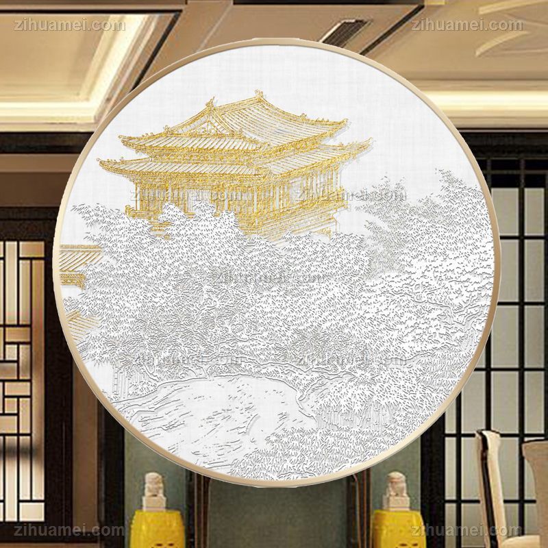 新中式圆形山水楼阁立体浮雕肌理画现代玄关素雅装饰画中式客厅挂画 3D打印